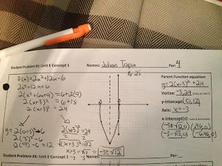 This picture shows how to find the different parts of a quadratic function using standard form, and then having to graph them. This picture demonstrates how to find the parent function equation, vertex, y-intercept, the axis of symmetry, and the x-intercepts.